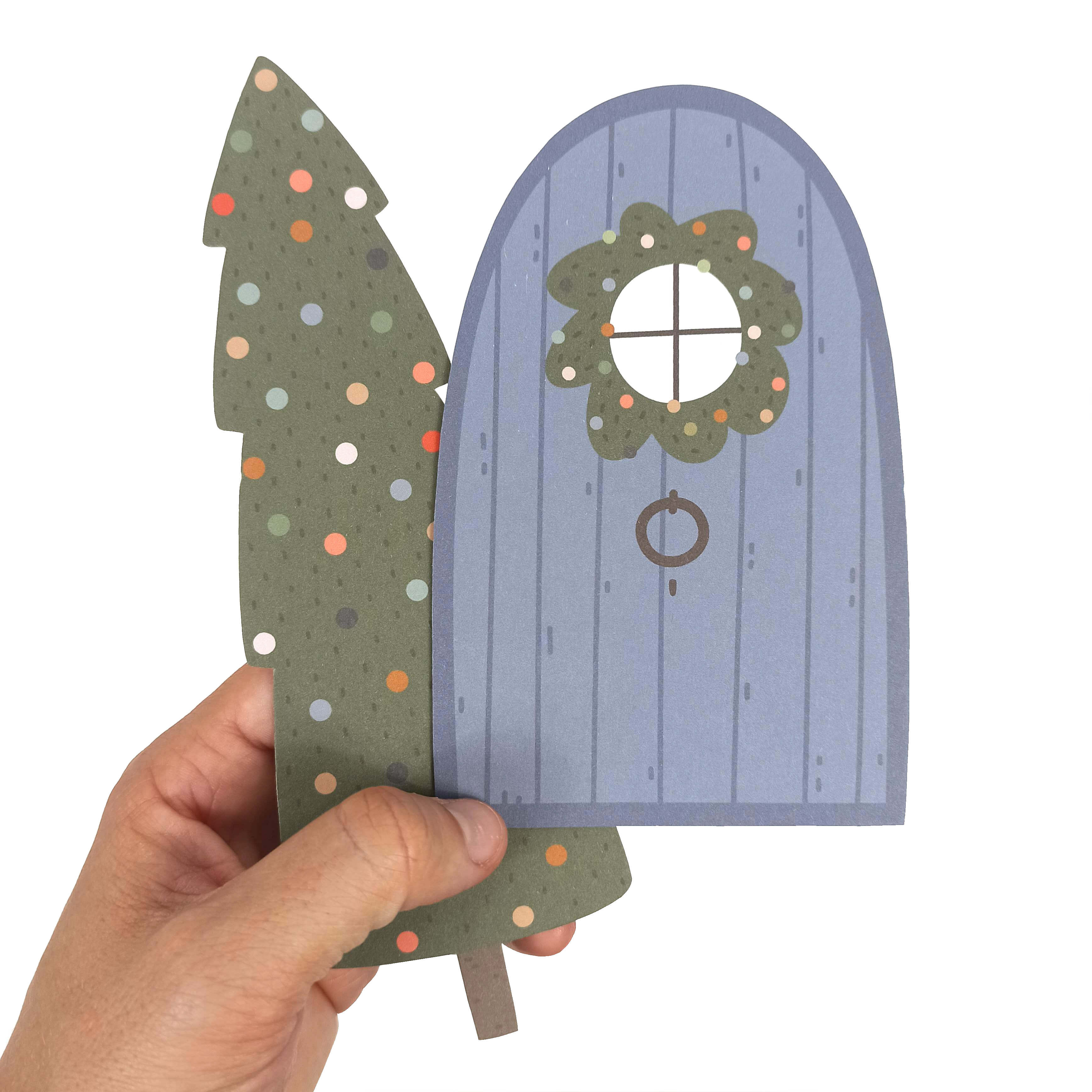 Samotné dvířka, stromeček, rohožku a další doporučuji podlepit kartónem (z krabice od cereálií, krabice od bot,...) a na vybrané místo nalepit oboustrannými lepícími kolečky (oboustrannou lepící páskou, lepící gumou,...).