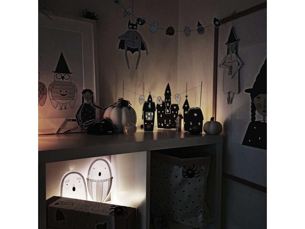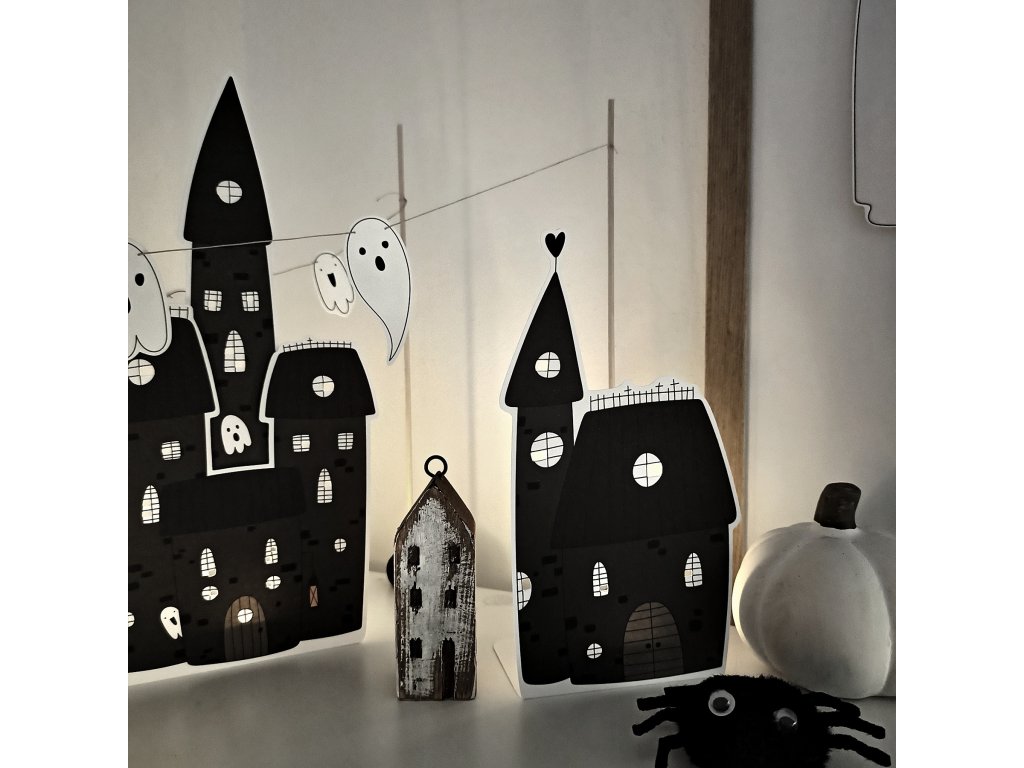 3 strašidelné papírové domečky a 6 duchů - stačí jen rozestavět na poličku nebo okenní parapet, nainstalovat čajovky na baterky nebo světelný řetěz a parádní - strašidelná - světelná dekorace je na světě.