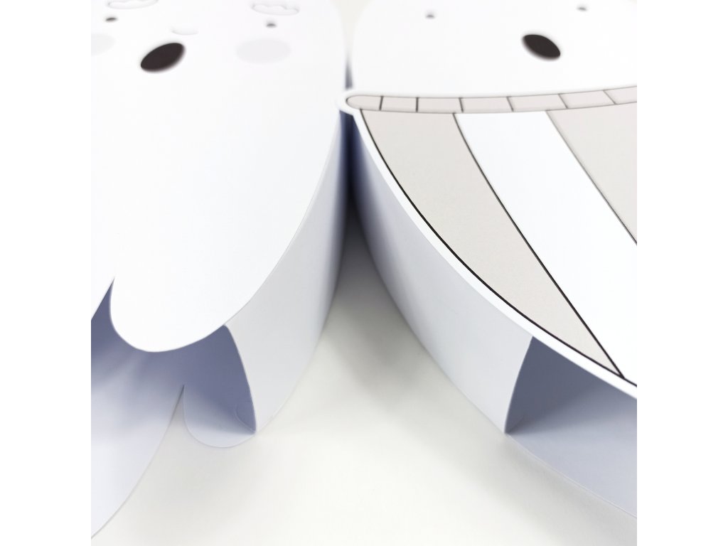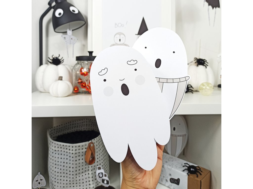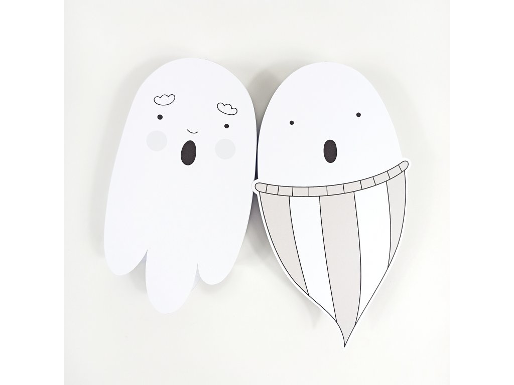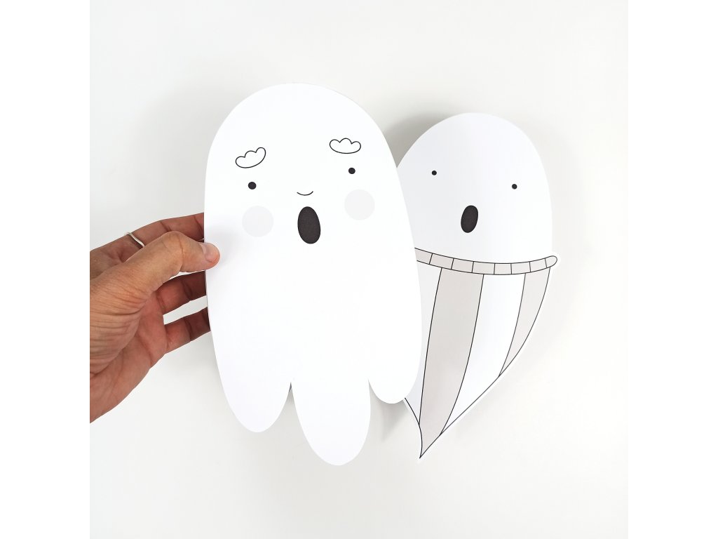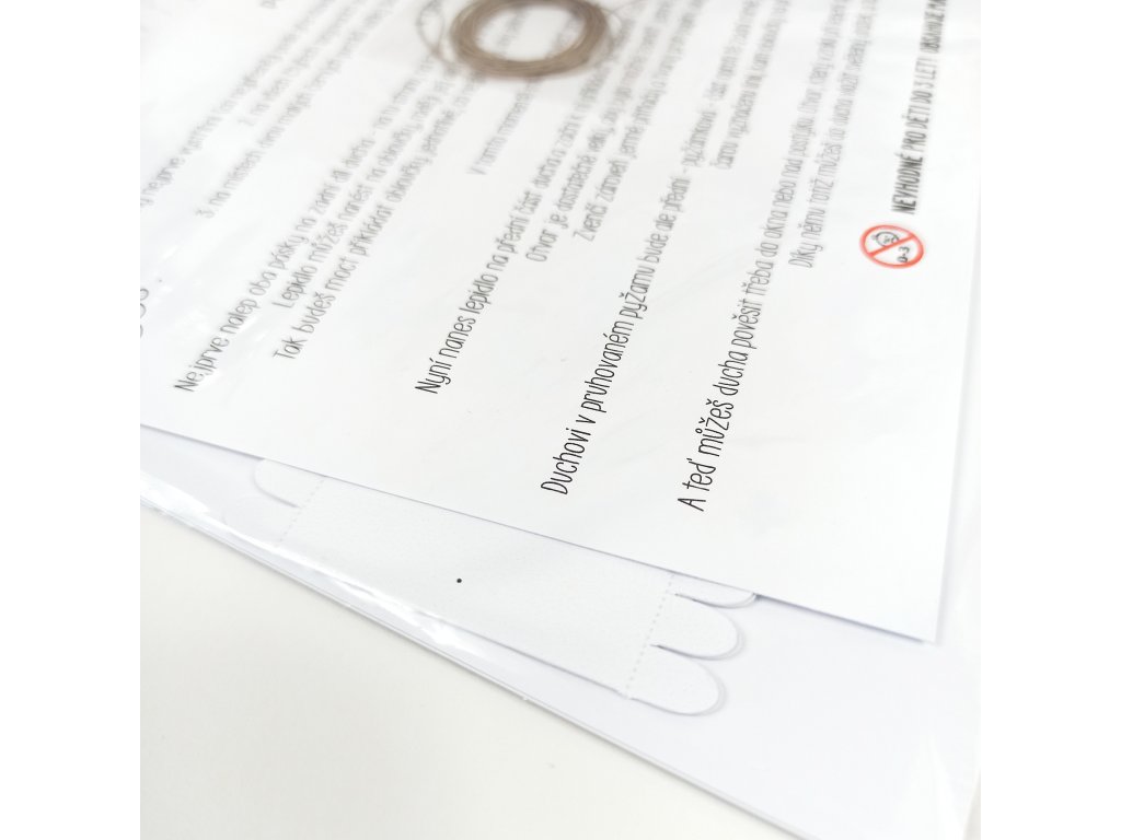 Duchové jsou vytištění na grafický papír vyšší gramáže (250g). Součástí balení jsou také již vyřezané spojovací pásky, díky kterým získají duchové po slepení 3D rozměr, návod k sestavení a provázek k zavěšení.