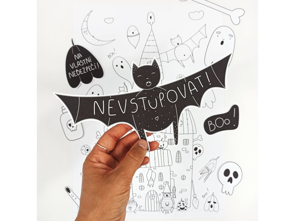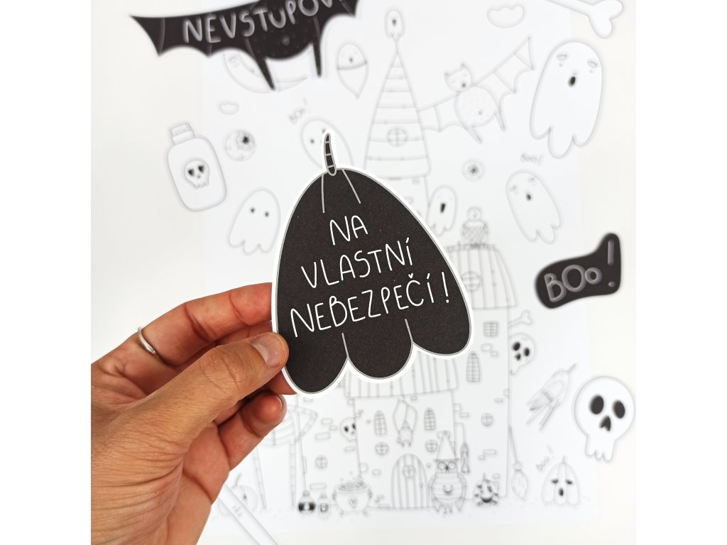 Plakát tedy děti vybarví, výstražné obrázky vybarví a vystříhnou a vše pěkně nalepí (washi páskou, lepící gumou,...) na dveře.