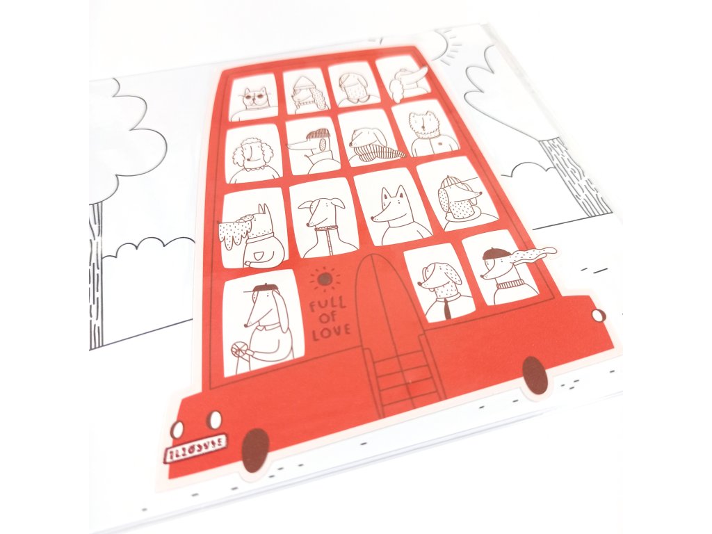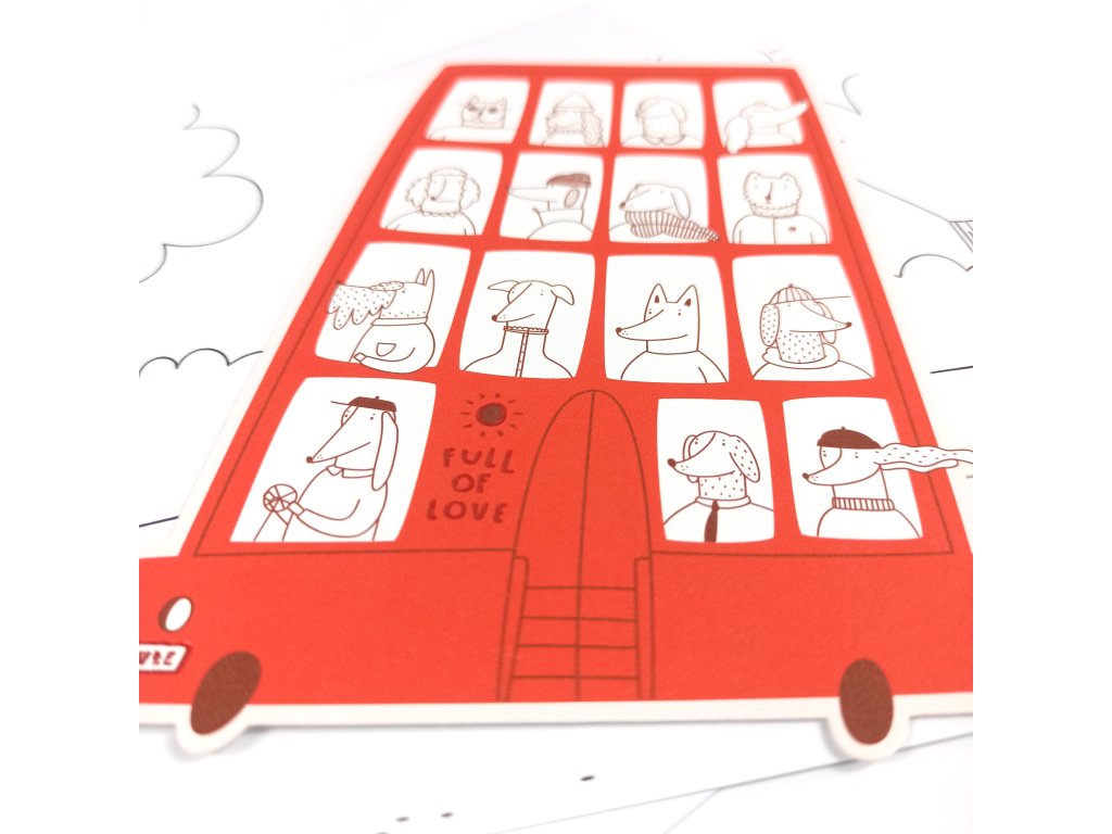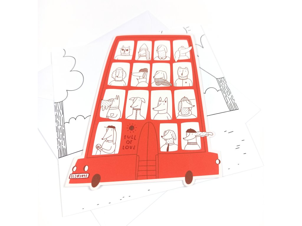 Tato kartička ve tvaru autobusu plného pejsků je vyrobena z tvrdého grafického papíru Munken Polar (300g), ozdobená efektní metalickou fólií (nápis "Full of love" a SPZka :)) a doplněná čtvercovou kartičkou a obálkou.
