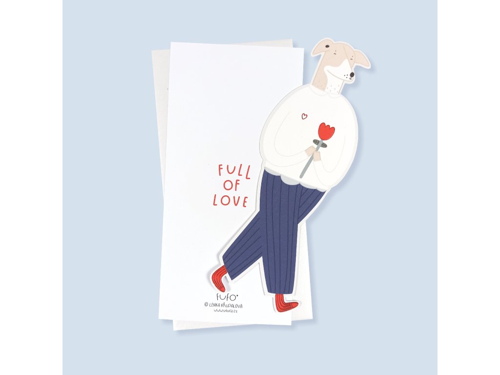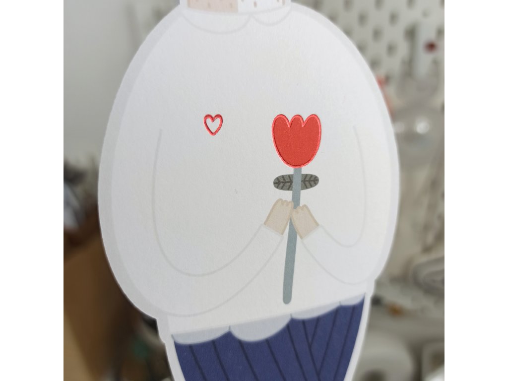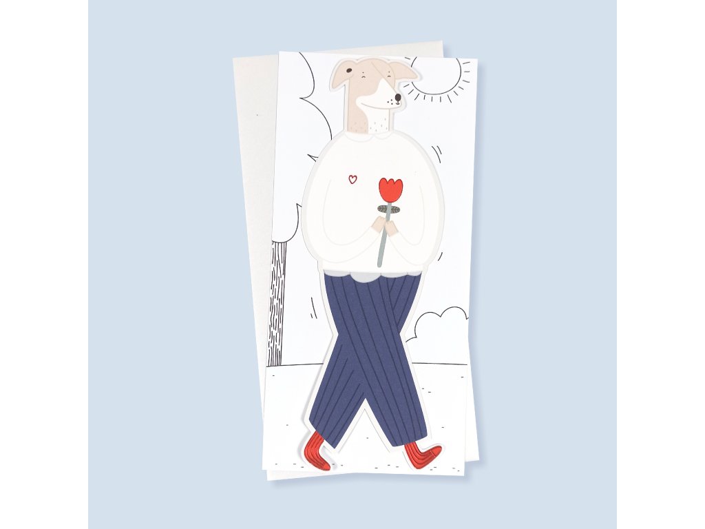 Co třeba tato kartička ve tvaru pejska s tulipánem, která je vyrobena z tvrdého grafického papíru Munken Polar (300g), ozdobená efektní metalickou fólií (nápis tulipán, srdíčko, ponožky) a doplněná kartičkou a obálkou.