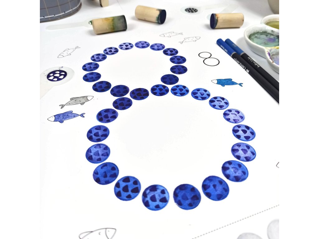 Úkolem je tedy trefit se punťokem, namočeným do vodové barvičky, co nejpřesněji do předkreslené kružnice.