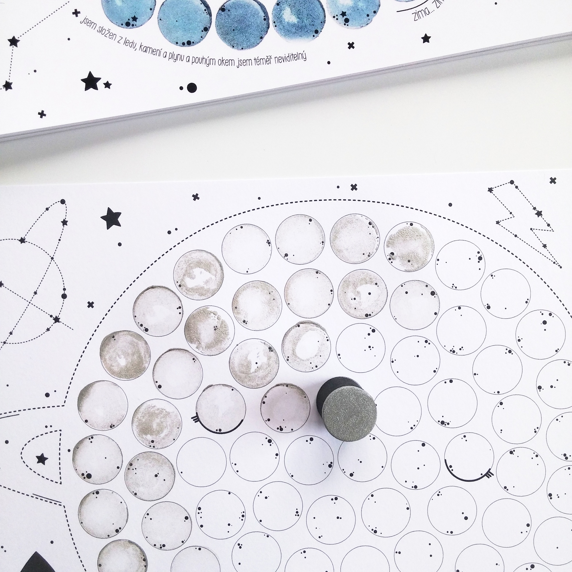 Úkolem je tedy trefit se punťokem, namočeným do vodové barvičky, do předkreslené kružnice a postupně celou planetu dotvořit.