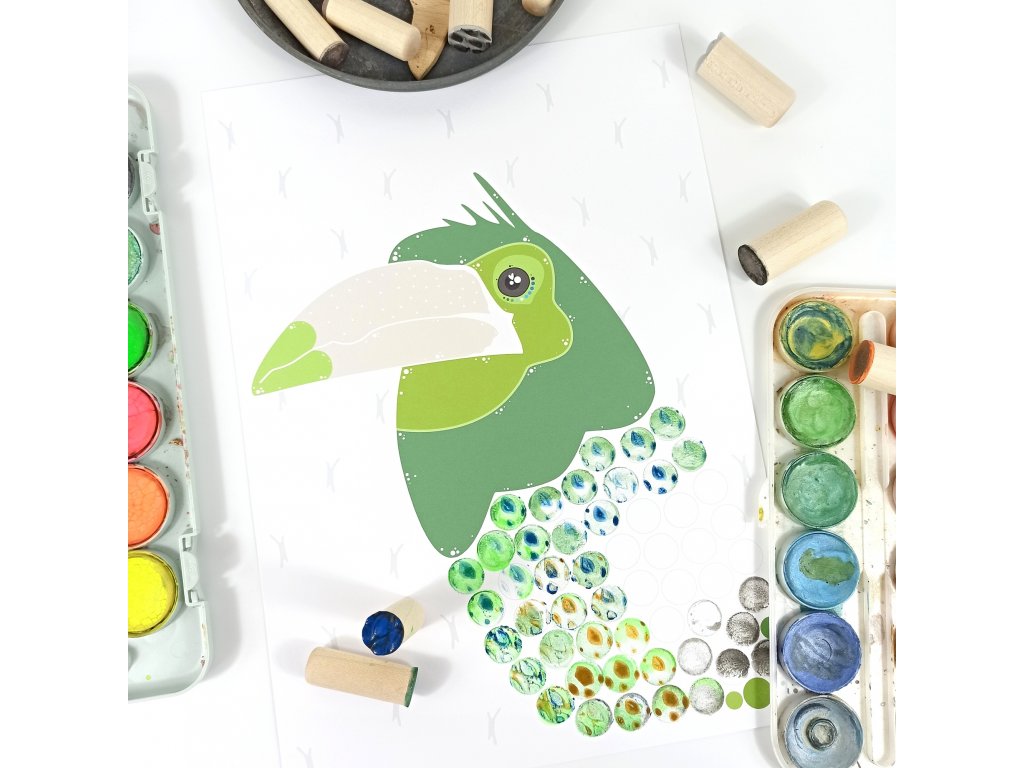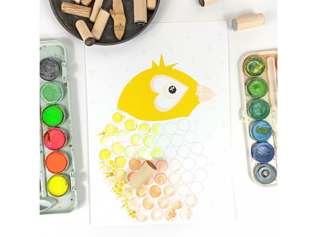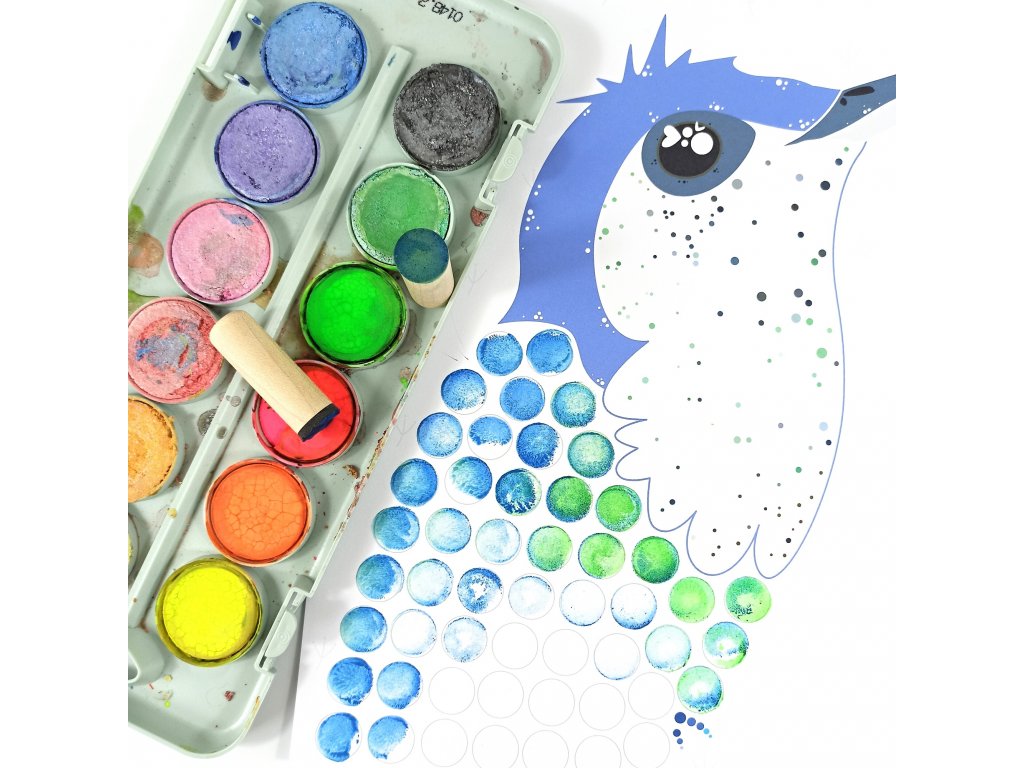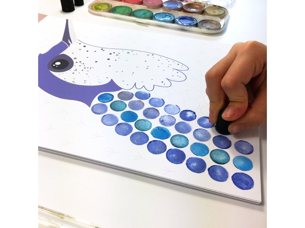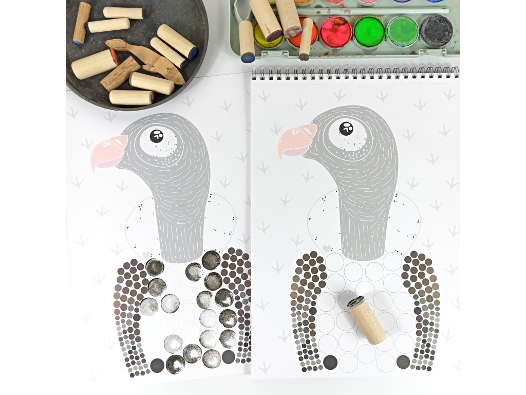 A aby bylo to puntíkování ještě zábavnější, můžete základní sadu punťoků doplnit o vzorované punťoky. Těmi mohou děti ptáčkům dotvořit krásně barevné skvrnky, ale také dopuntíkovat oblohu, vodu, kamínky,...