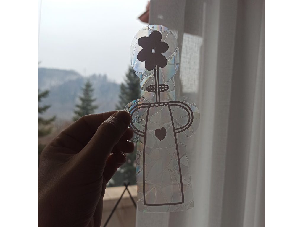 Je vyrobena ze speciální statické přilnavé fólie - na okně tak drží bez lepidla, pomocí statické elektřiny, a tak ji můžete libovolně přesouvat (nejen z místnosti do místnosti, ale i tak, abyste našli to ideální umístění na okně pro ty nejkrásnější duhy).