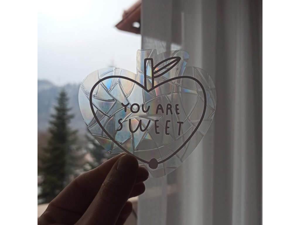 Je vyrobena ze speciální statické přilnavé fólie - na okně tak drží bez lepidla, pomocí statické elektřiny, a tak ji můžete libovolně přesouvat (nejen z místnosti do místnosti, ale i tak, abyste našli to ideální umístění na okně pro ty nejkrásnější duhy).